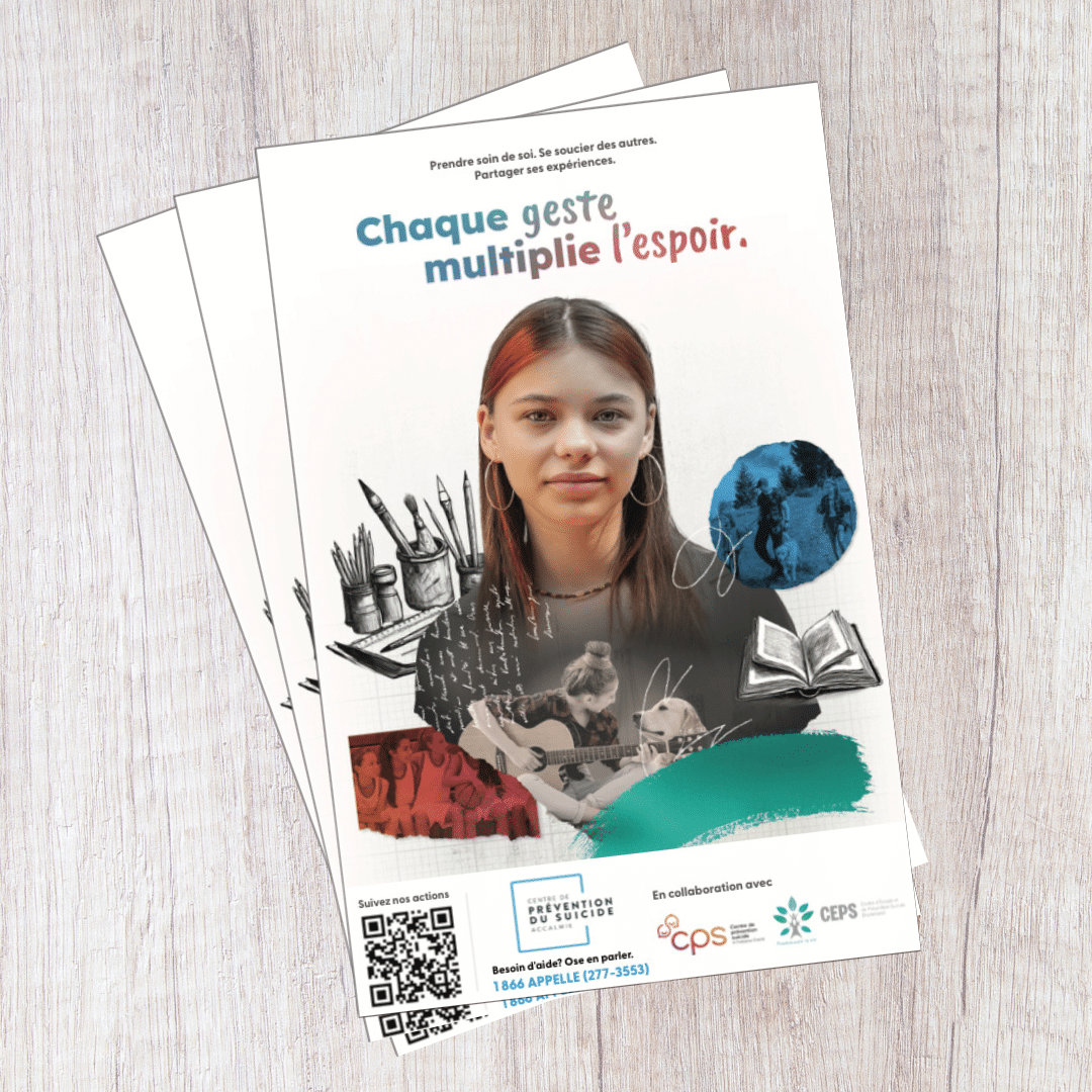 Cette affiche (11 po x 17 po), issue de la campagne de sensibilisation « Chaque geste multiplie l’espoir », réalisée en collaboration avec les centres de prévention du suicide de la Mauricie-Centre-du-Québec, souligne l’importance de prendre soin de soi à travers des gestes simples mais puissants. Des activités comme passer du temps à pratiquer ce qui nous fait du bien peuvent avoir un impact considérable sur notre bien-être. Cette affiche peut être affichée dans divers lieux pour rappeler à chacun de prendre du temps pour soi. Elle présente le slogan de la campagne, le logo des centres de prévention, le numéro de la ligne d’intervention 24/7, ainsi qu’un code QR qui mène directement à multiplielespoir.ca pour plus de ressources.